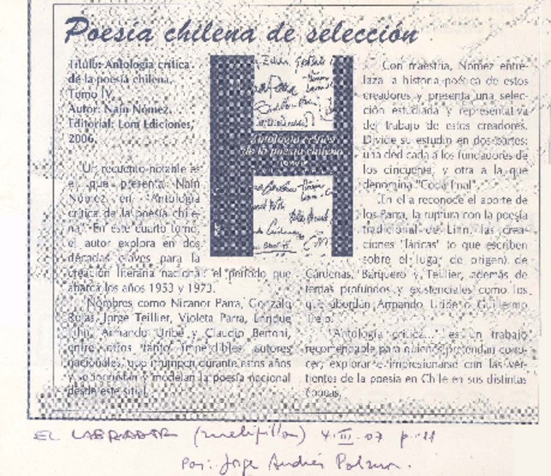 Poesía chilena de selección [artículo] Jorge Andrés Palma.
