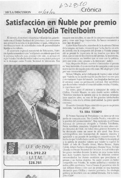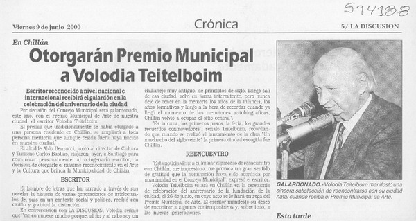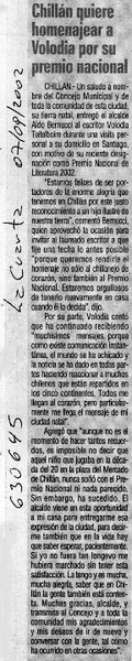Chillán quiere homenajear a Volodia por su premio nacional [artículo].