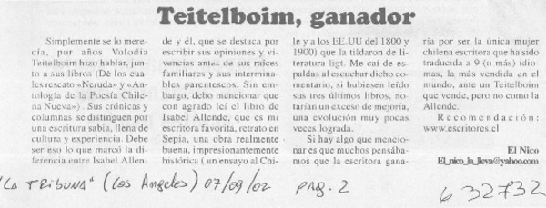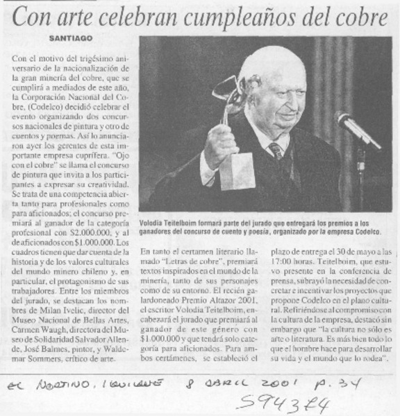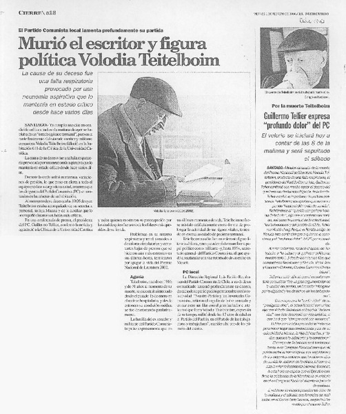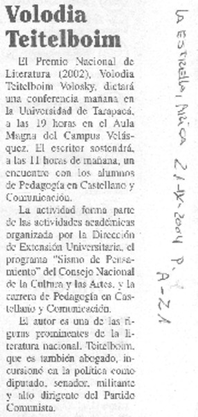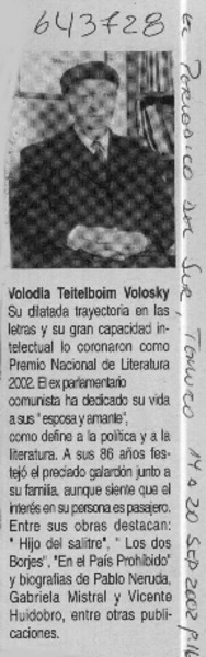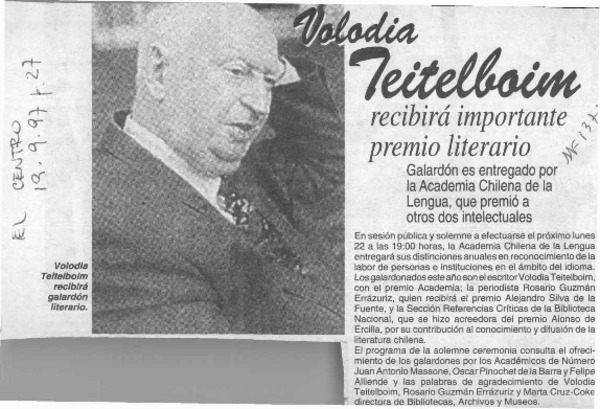 Volodia Teitelboim recibirá importante premio literario [artículo].