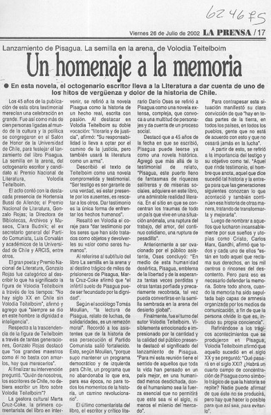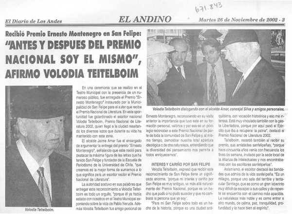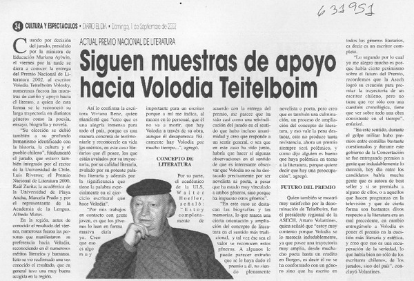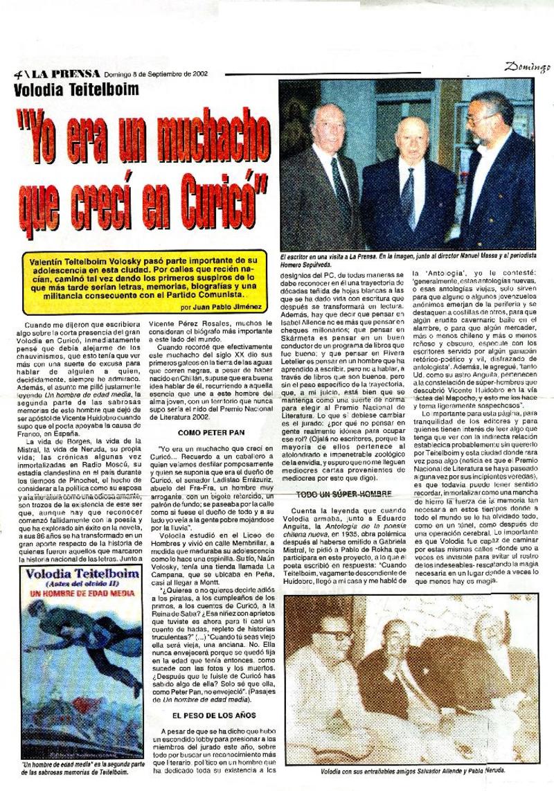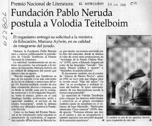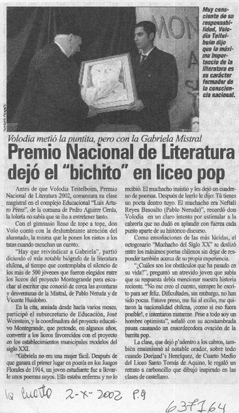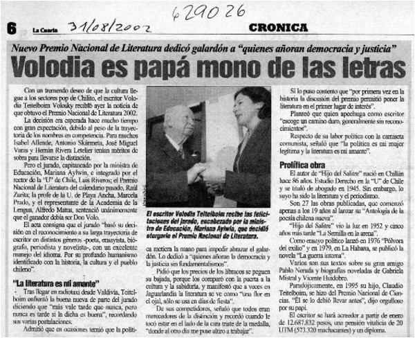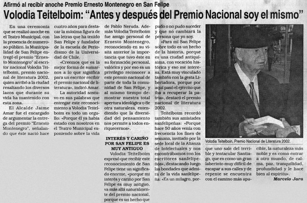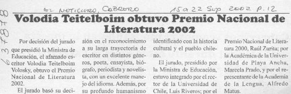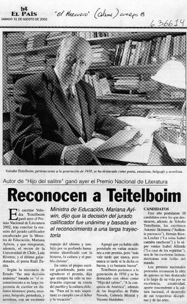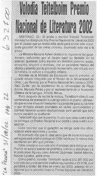 Volodia Teitelboim valoró participación de opinión pública en el Premio Nacional de Literatura 2002 [artículo]
