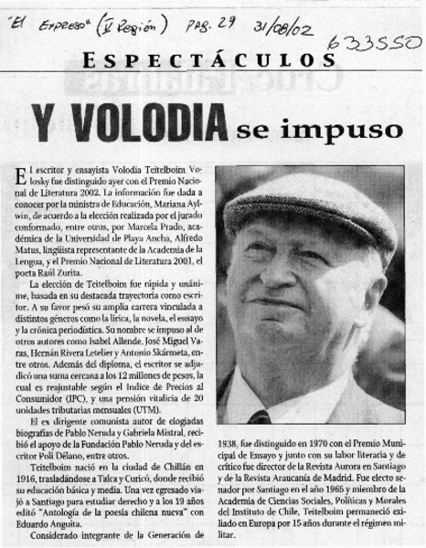 Volodia Teitelboim obtuvo Premio Nacional de Literatura 2002 [artículo]
