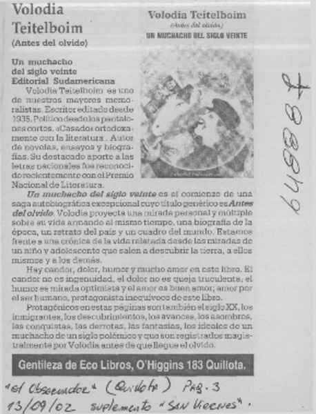 Autores chilenos - Teitelboim, Volodia - Un muchacho del siglo XX