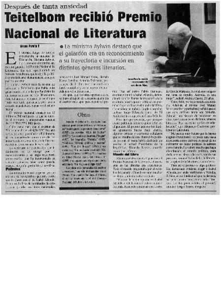 Apoyan a Teitelboim para Premio de Literatura [artículo]