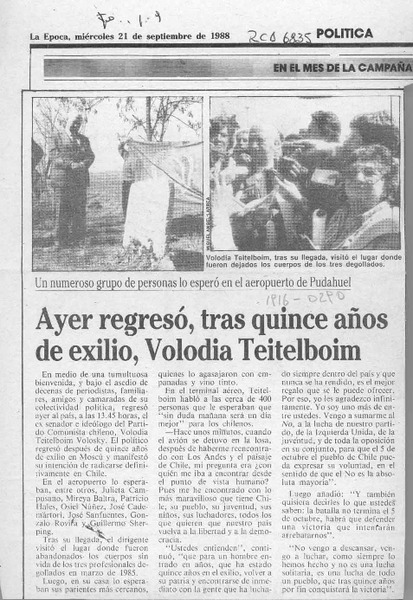Ayer regresó, tras quince años de exilio, Volodia Teitelboim [artículo].