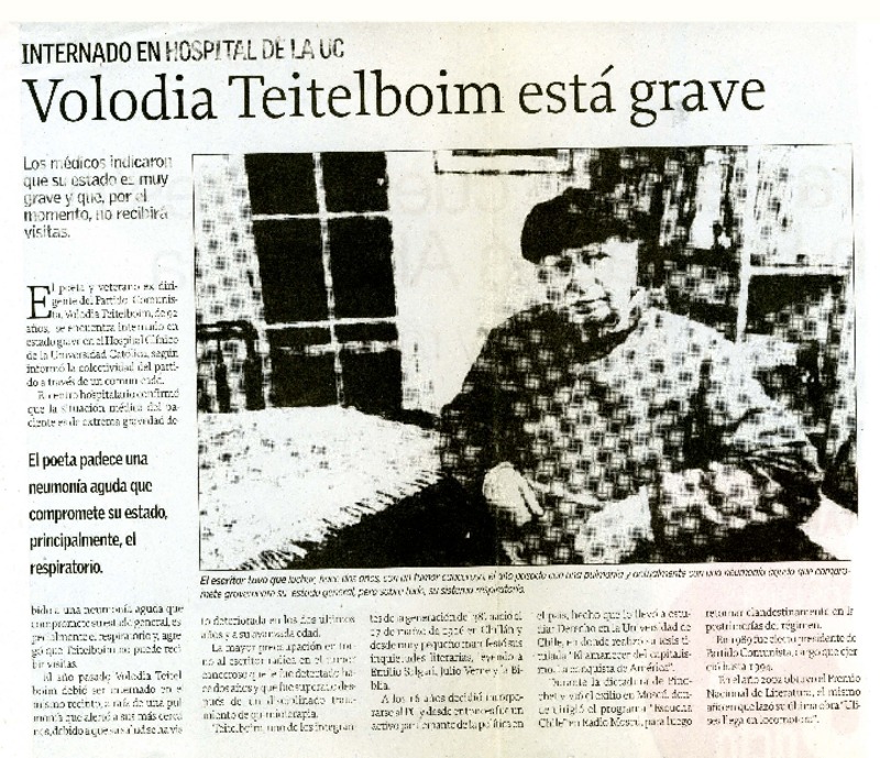 Continúa internado grave escritor y dirigente PC Volodia Teitelboim [artículo].