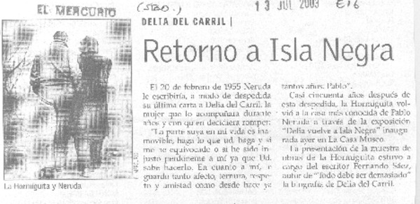 Retorno a Isla Negra Delia del Carril. [artículo] :
