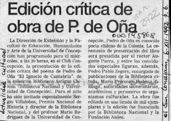 Pedro de Oña" [artículo] Augusto César Roa V.