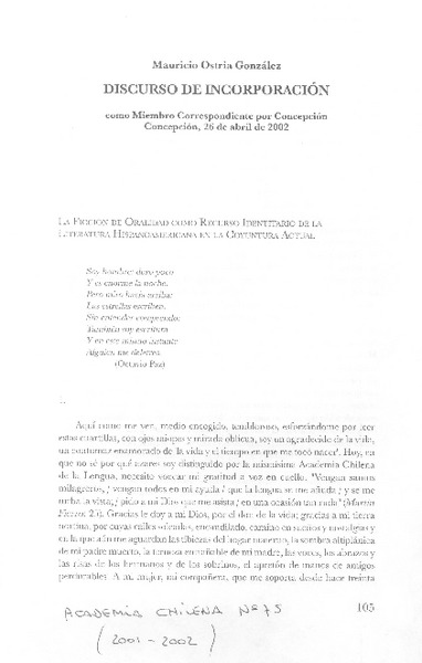 Discurso de incorporación [artículo] Mauricio Ostria González.