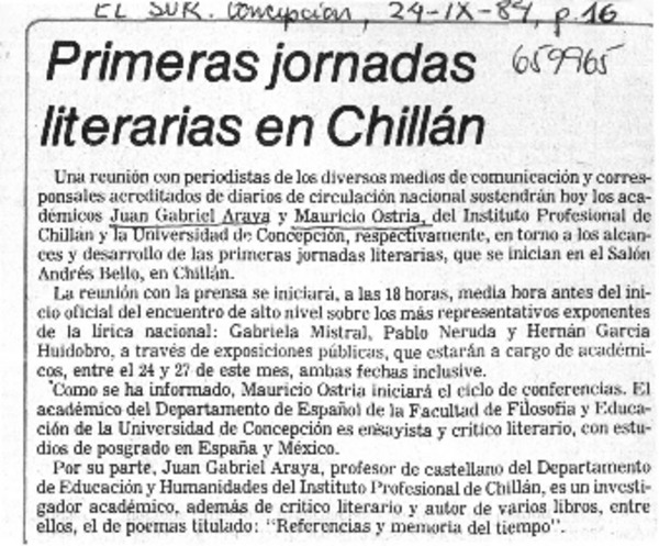 Primeras jornadas literarias en Chillán. [artículo]