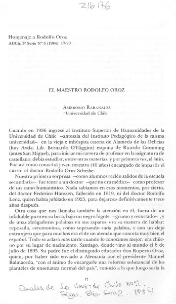 El maestro Rodolfo Oroz [artículo] Ambrosio Rabanales.