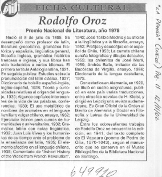 Rodolfo Oroz, Premio Nacional de Literatura. [artículo]