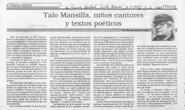 Talo Mansilla, niños cantores y textos poéticos [artículo] Marino Muñoz Lagos.