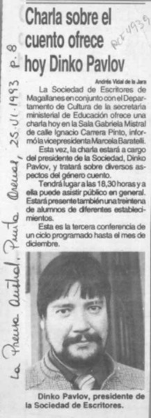 Charla sobre el cuento ofrece hoy Dinko Pavlov [artículo] Andrés Vidal de la Jara.