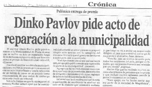 Dinko Pavlov pide acto de reparación a la municipalidad [artículo]