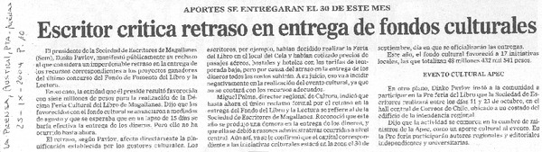 Escritor critica retraso en entrega de fondos culturales [artículo]