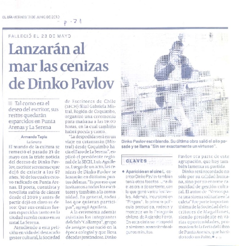 Lanzarán al mar las cenizas de Dinko Pavlov [artículo] Armando Tapia.