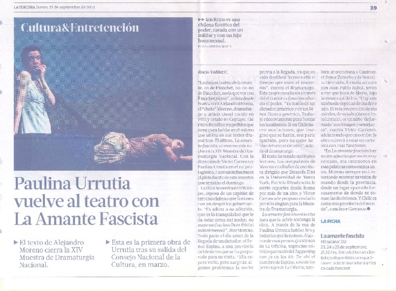 Paulina Urrutia vuelve al teatro con La amante fascista [artículo] Rocío Valdez C.