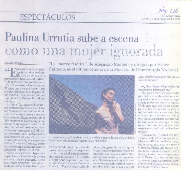 Paulina Urrutia a escena como una mujer ignorada [artículo] Eduardo Miranda.