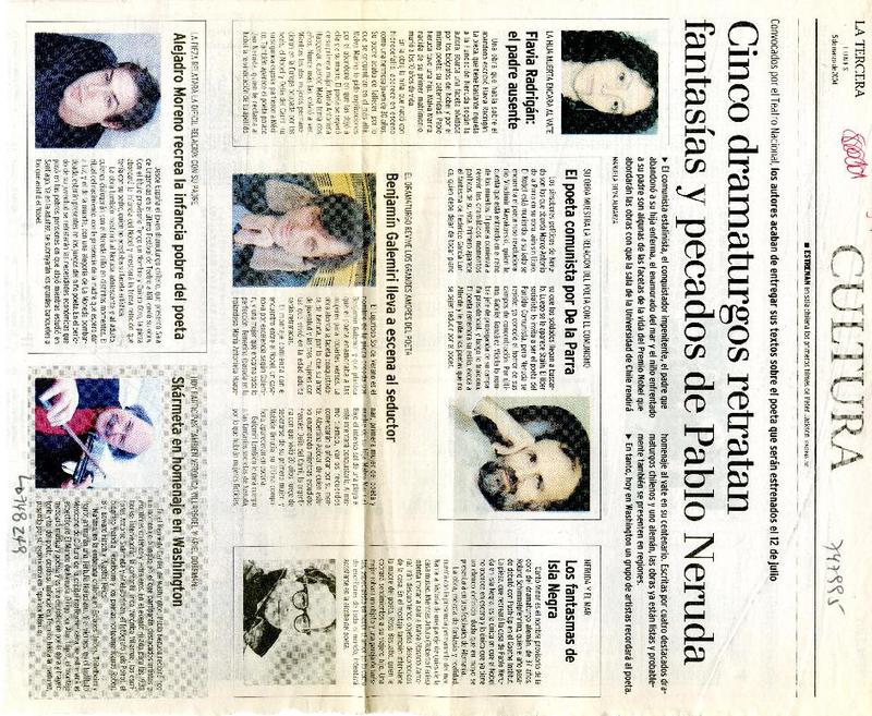 Cinco dramaturgos retrataran fantasías y pecados de Pablo Neruda [artículo] Manuela Silva Almarza.