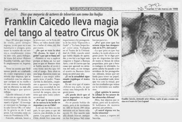 Franklin Caicedo lleva magia del tango al teatro Circus OK. [artículo]