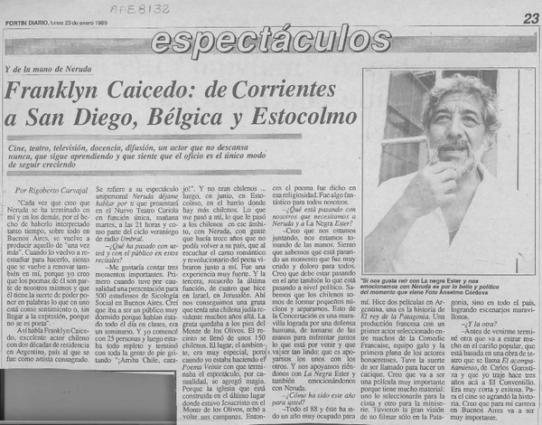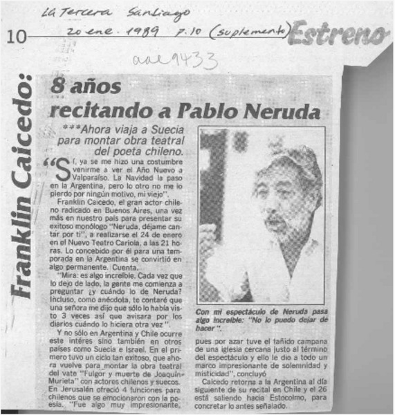 Franklin Caicedo recrea vida y poesía de Neruda. [artículo]