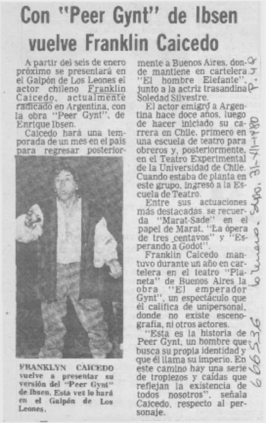 Con "Peer Gynt" de Ibsen vuelve Franklin Caicedo. [artículo]