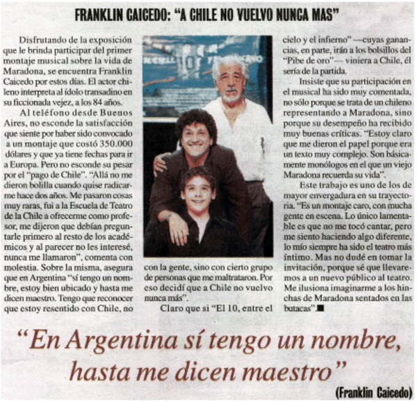 "Soy admirador de Maradona, no del fútbol" Franklin Caicedo representará al astro trasandino en un musical sobre su vida [artículo] : Gonzalo Olavarria.