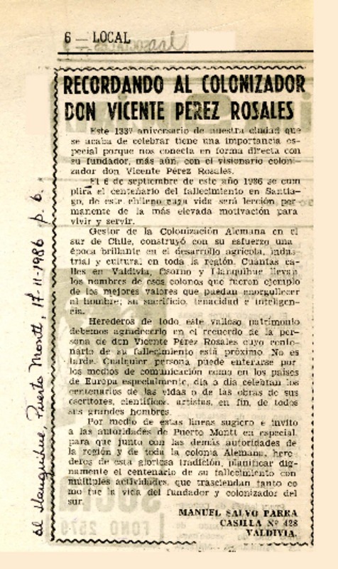 Recordando al colonizador don Vicente Pérez Rosales [artículo] Manuel Salvo Parra.