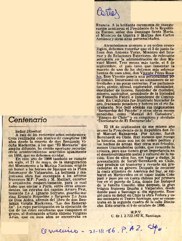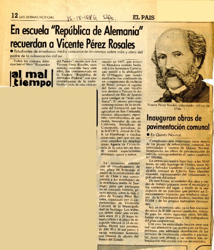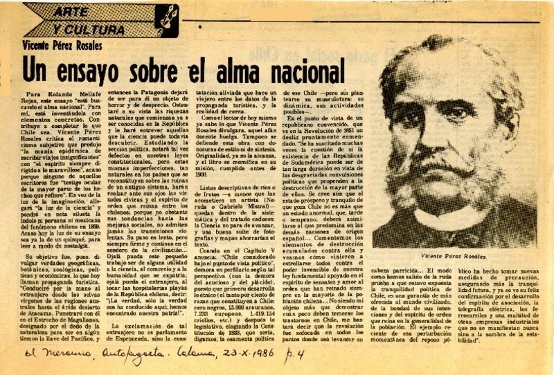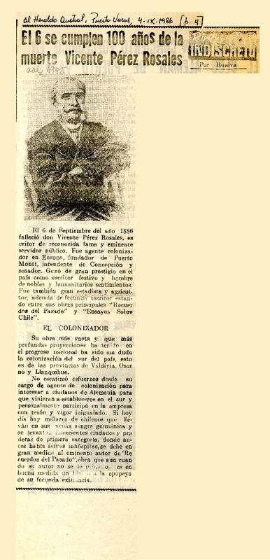 El 6 se cumplen 100 años de la muerte Vicente Pérez Rosales [artículo] Roalva.