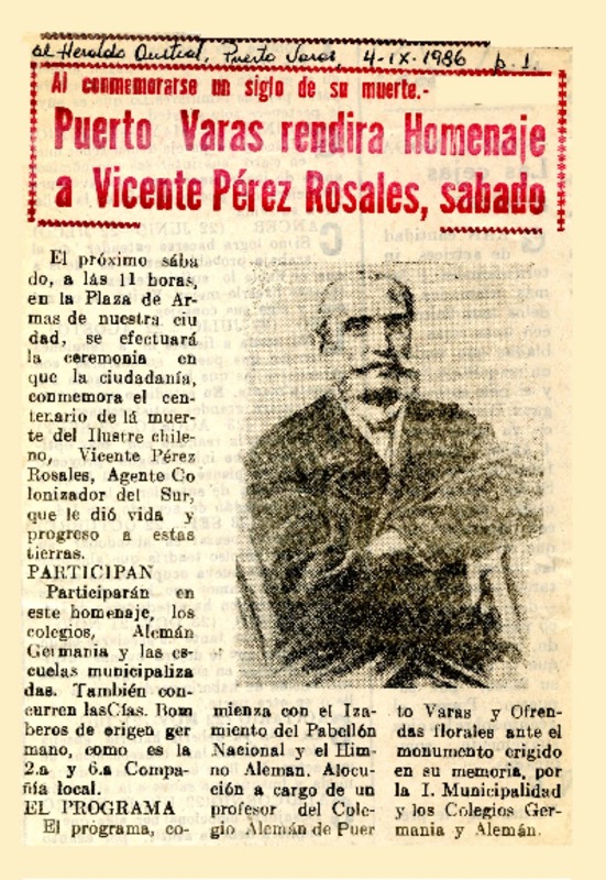Puerto Varas rendirá homenaje a Vicente Pérez Rosales, sábado [artículo].