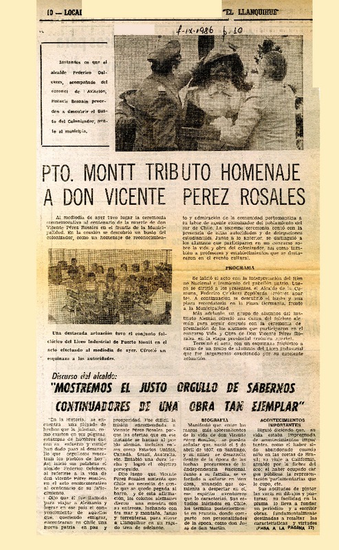 Pto. Montt tributó homenaje a don Vicente Pérez Rosales [artículo].