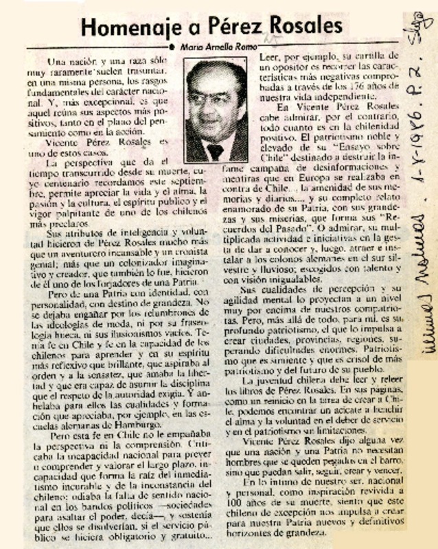 Homenaje a Pérez Rosales [artículo] Mario Arnello Romo.