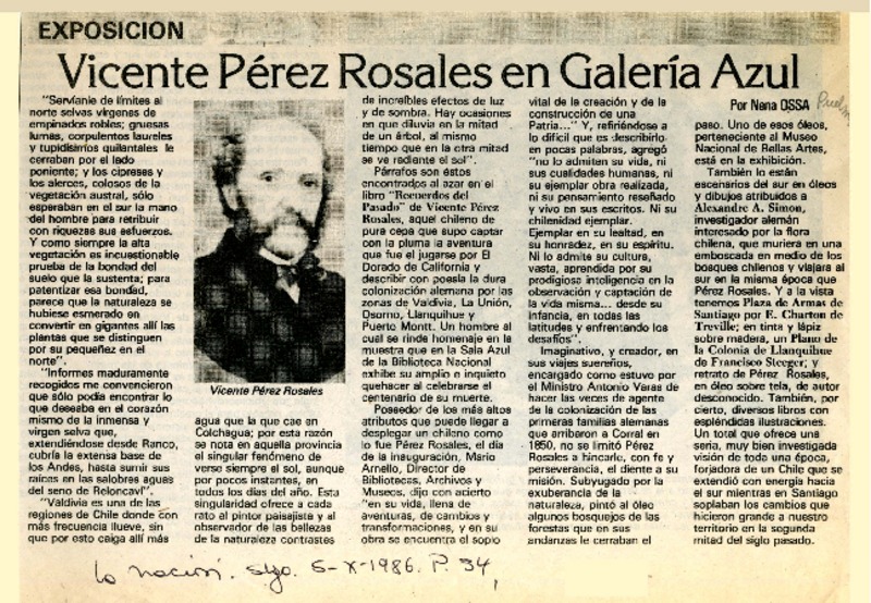 Vicente Pérez Rosales en Galería Azul [artículo] Nena Ossa.