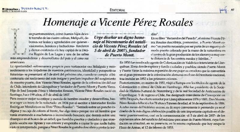 Homenaje a Vicente Pérez Rosales. [artículo]