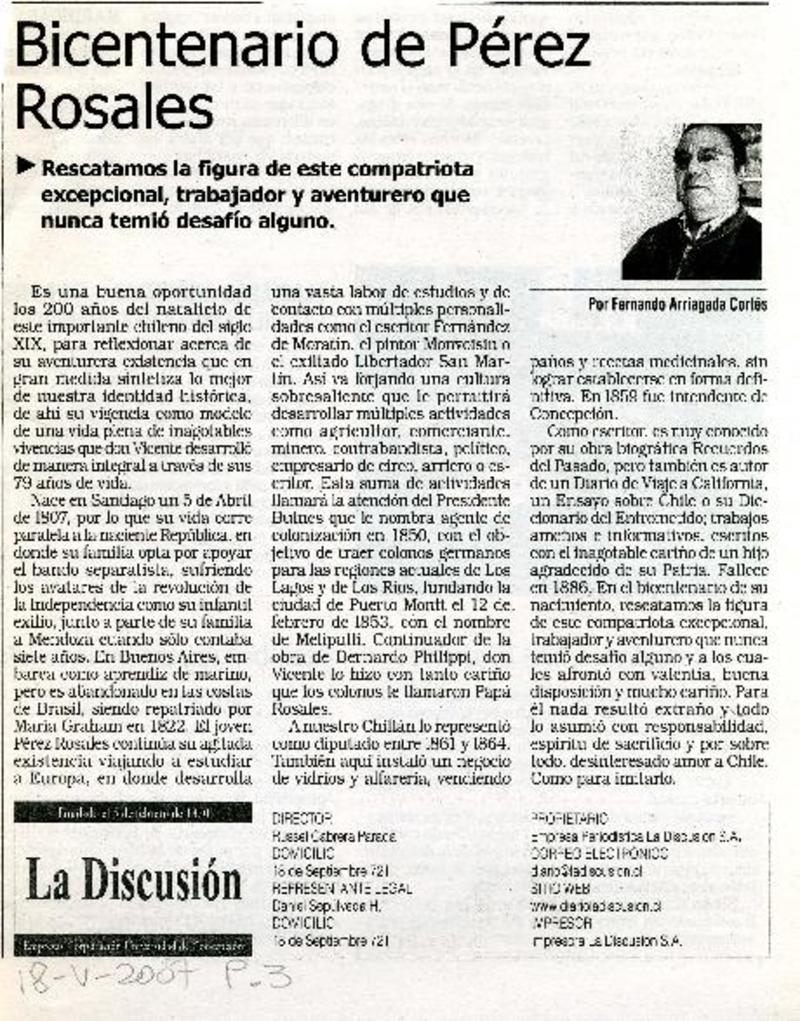Bicentenario de Pérez Rosales [artículo] Fernando Arriagada Cortés.