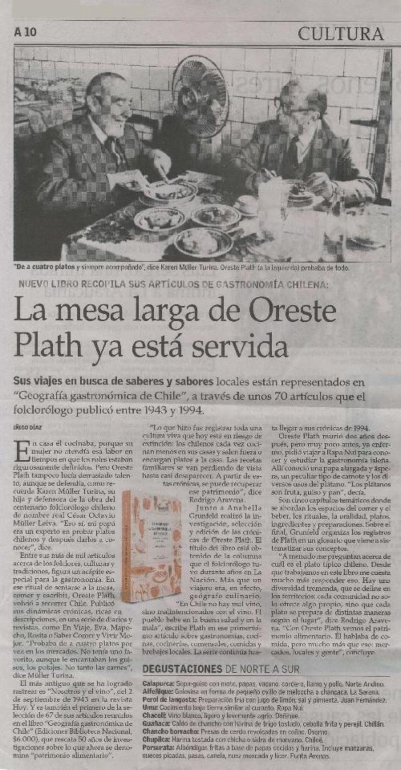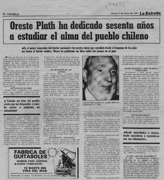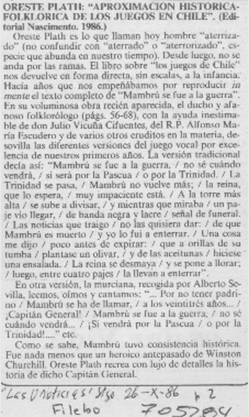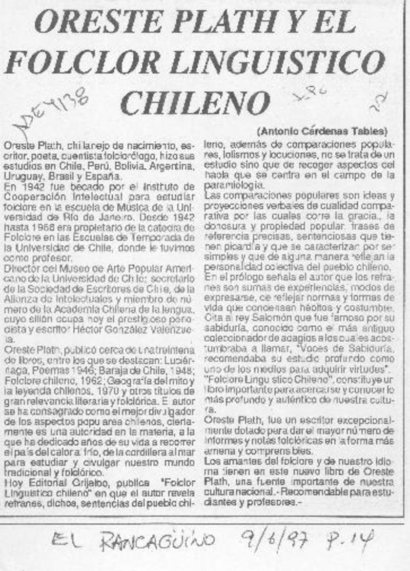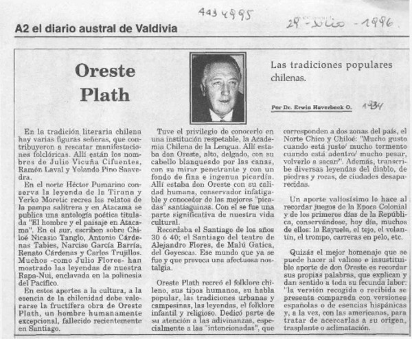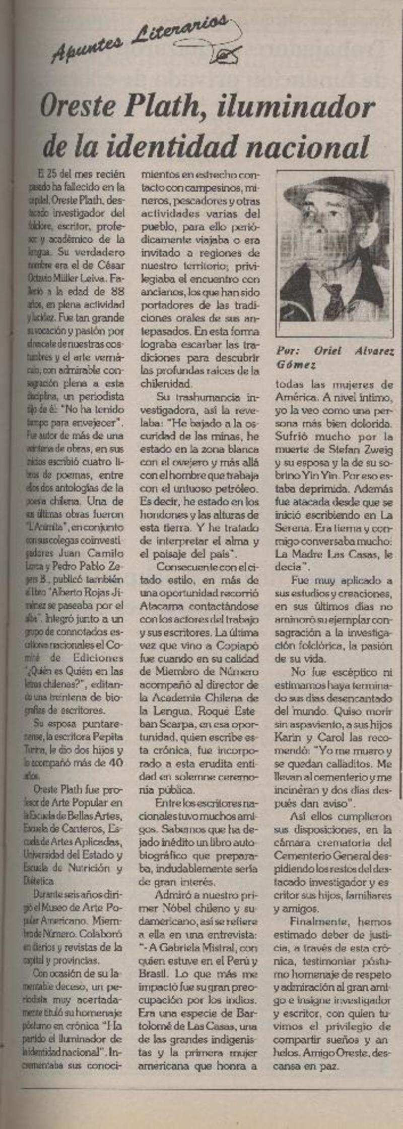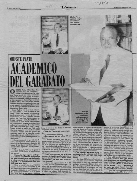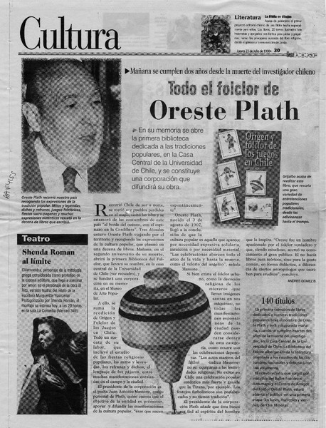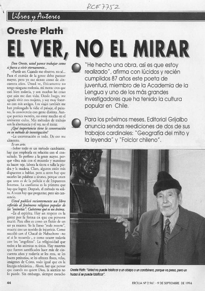 El folclorólogo Oreste Plath [artículo] Marino Muñoz Lagos.