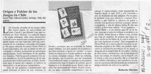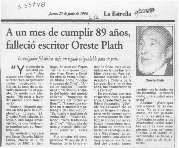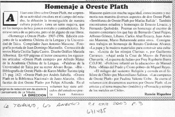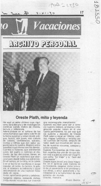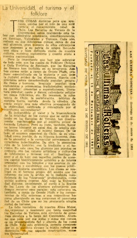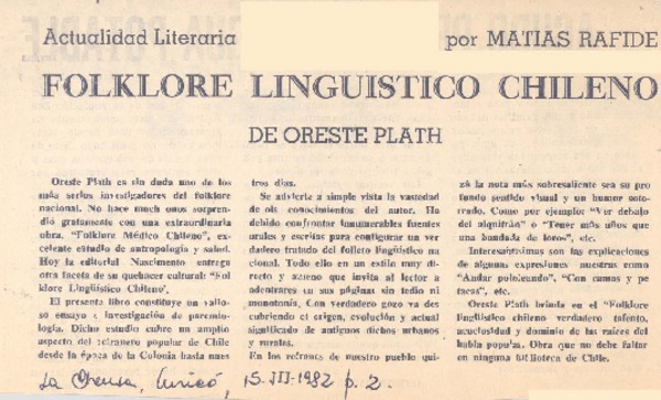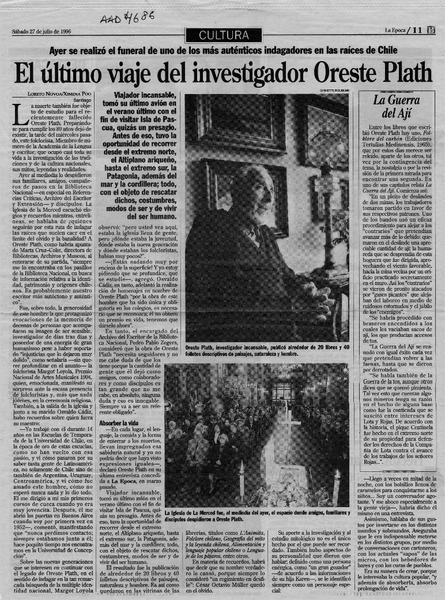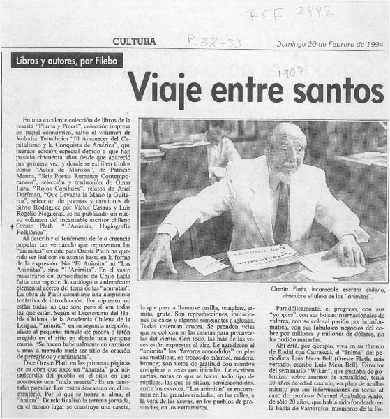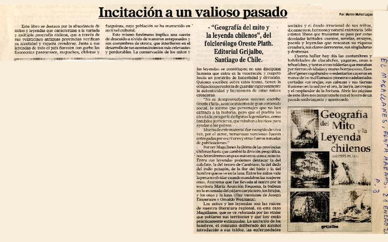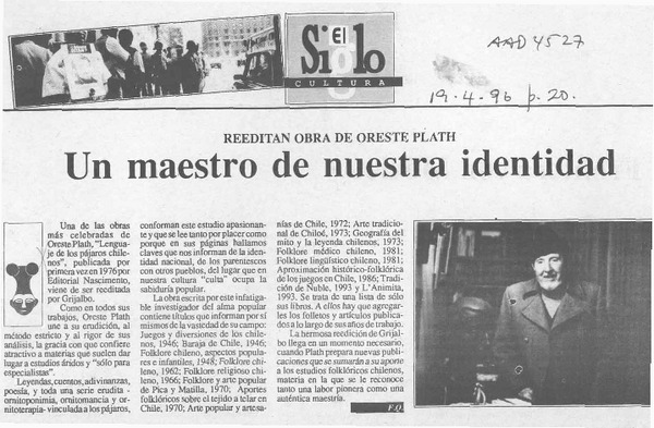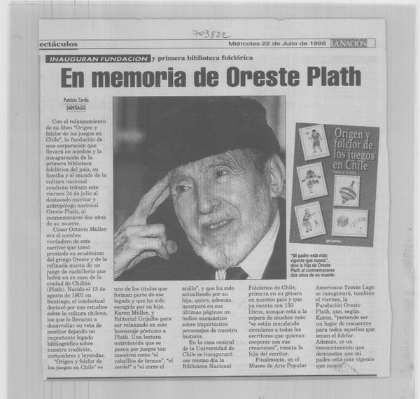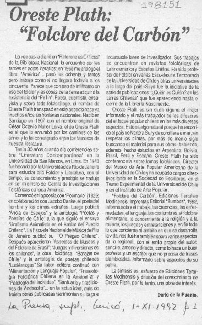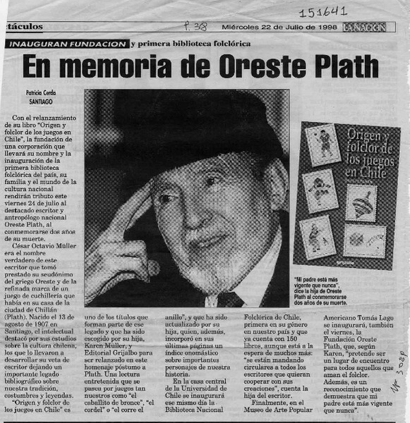 El folclorólogo Oreste Plath [artículo] Marino Muñoz Lagos.
