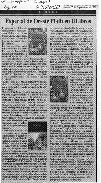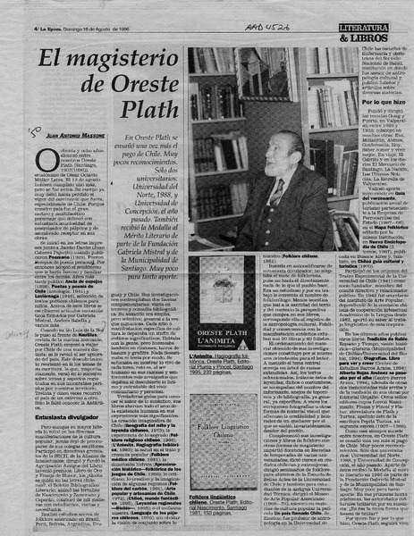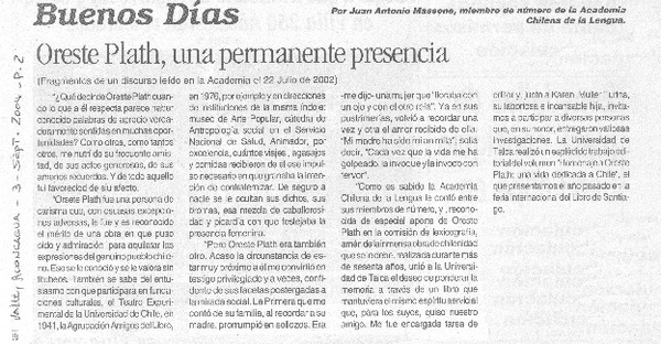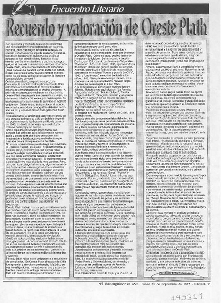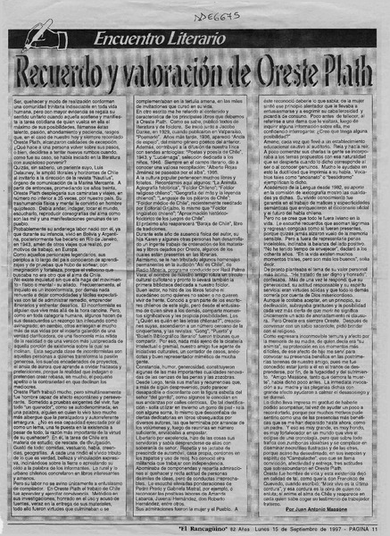 Recuerdo y valoración de Oreste Plath [artículo] Juan Antonio Massone.