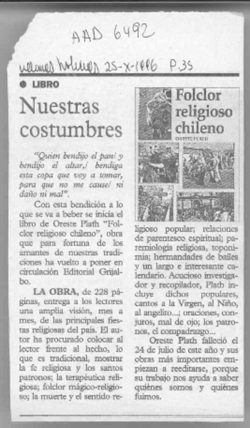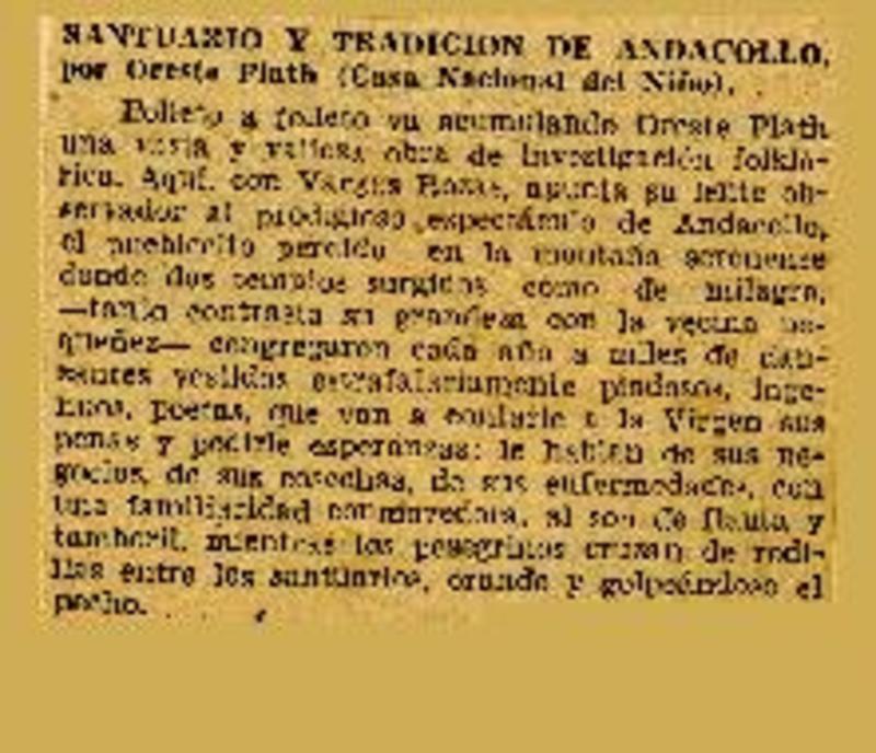 Santuario y tradición de Andacollo", Oreste Plath. [artículo]