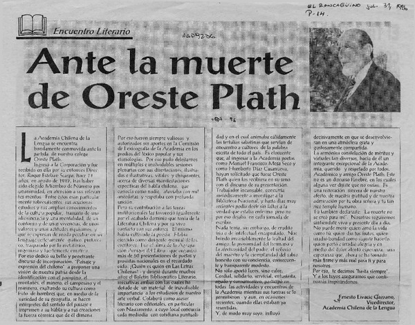 Ante la muerte de Oreste Plath [artículo] Ernesto Livacic Gazzano.
