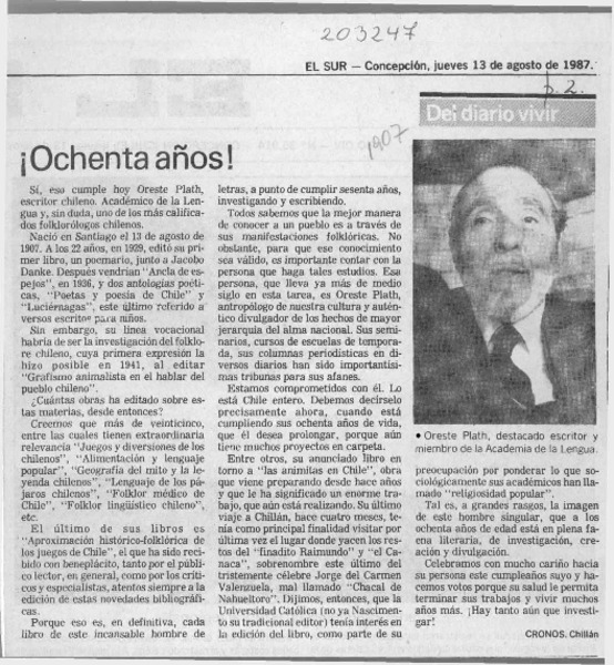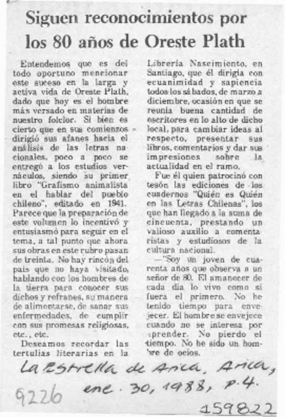 Siguen reconocimientos por los 80 años de Oreste Plath [artículo].