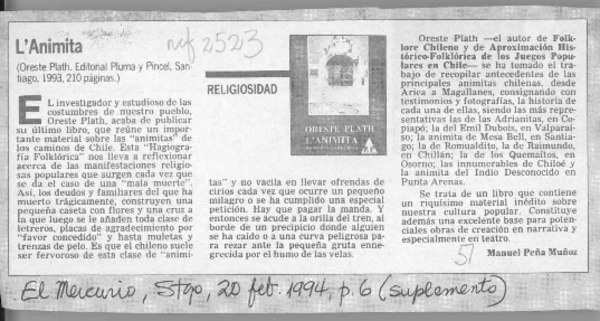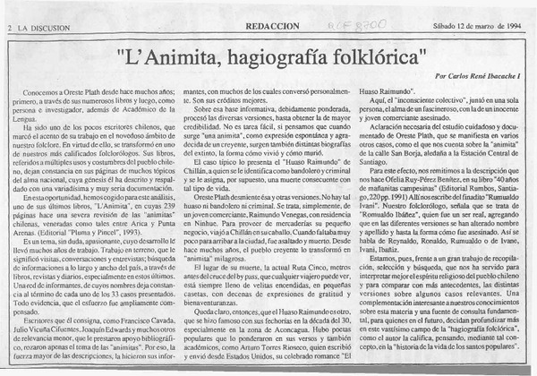 "L'Animita" [artículo] Fernando Arriagada Cortés.