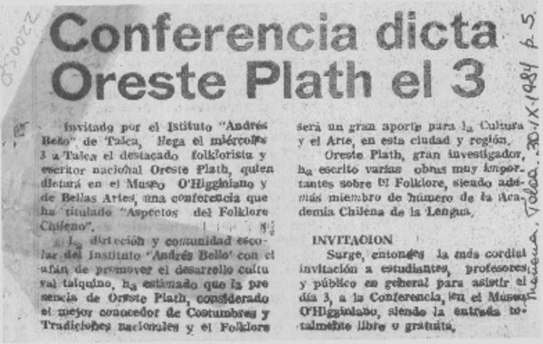 Conferencia dicta Oreste Plath el 3 [artículo].