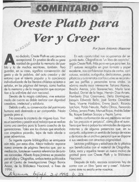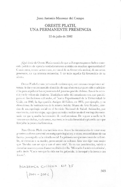 Recuerdo y valoración de Oreste Plath [artículo] Juan Antonio Massone