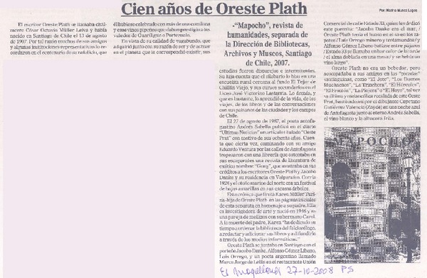 Cien años de Oreste Plath [artículo]Marino Muñoz Lagos.