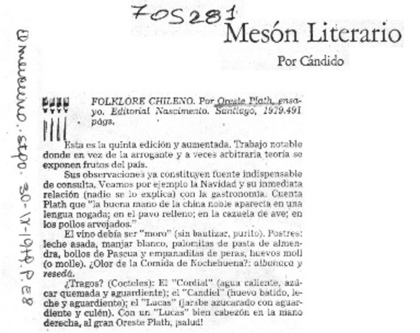 Baraja de Chile" interesante obra folklórica de Oreste Plath [artículo] W.