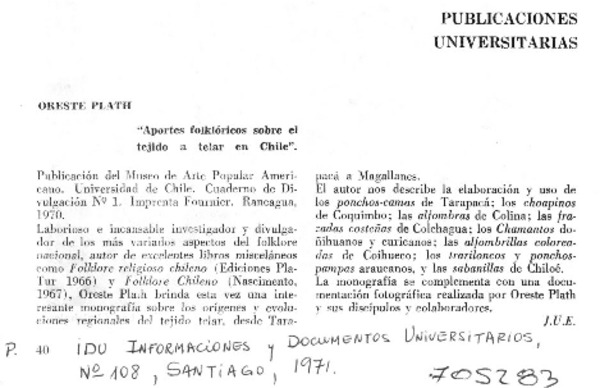 Autores chilenos - Plath, Oreste - Aportes folklóricos sobre el tejido a telar en Chile