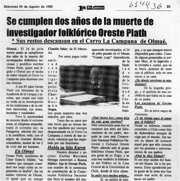 Se cumplen dos años de la muerte de investigador folklórico Oreste Plath [artículo].