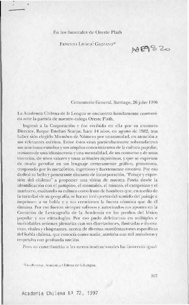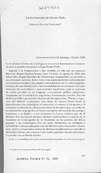 Discurso de recepción de D. Oreste Plath [artículo] Oreste Plath.