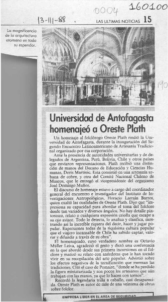 Universidad de Antofagasta homenajeó a Oreste Plath [artículo].